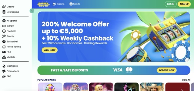 - Samba Slots – värvikas ja elava kujundusega kasiino, mis pakub mängijatele iganädalast cashback’i ning suurepärast valikut populaarseid slotte.