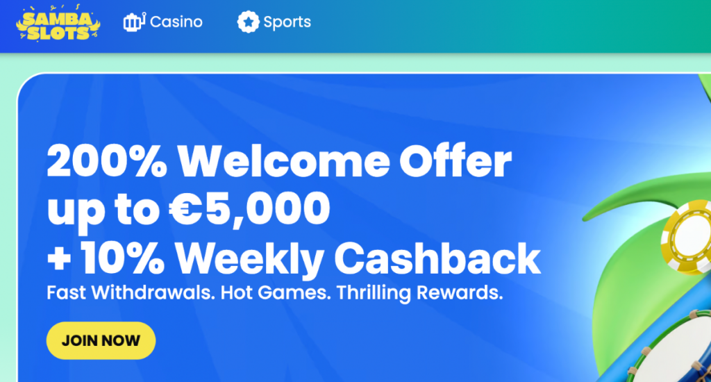 3. Samba Slots – kazino internetu su plačiu žaidimų pasirinkimu ir aukštos kokybės bonusais
